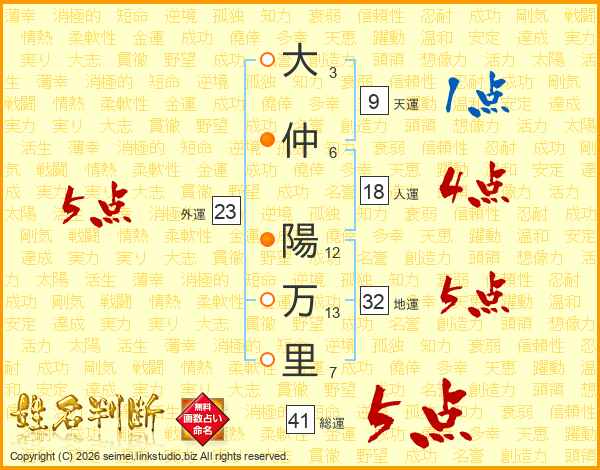 大(3画)仲(6画) 陽(12画)万(13画)里(7画)