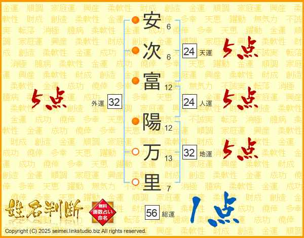 安(6画)次(6画)富(12画) 陽(12画)万(13画)里(7画)