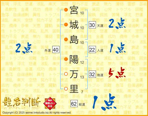 宮(10画)城(10画)島(10画) 陽(12画)万(13画)里(7画)