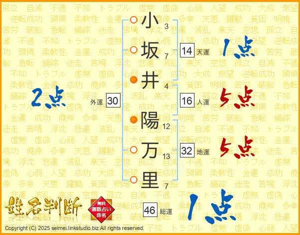 小(3画)坂(7画)井(4画) 陽(12画)万(13画)里(7画)