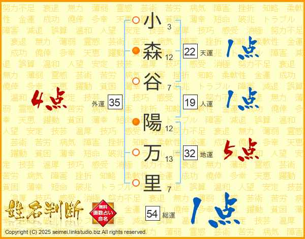 小(3画)森(12画)谷(7画) 陽(12画)万(13画)里(7画)
