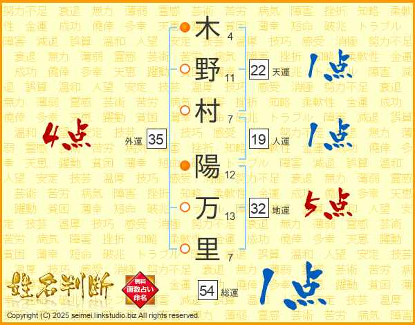 木(4画)野(11画)村(7画) 陽(12画)万(13画)里(7画)