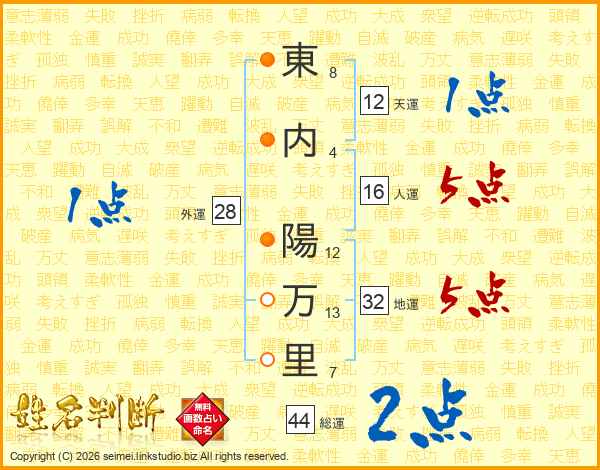 東(8画)内(4画) 陽(12画)万(13画)里(7画)