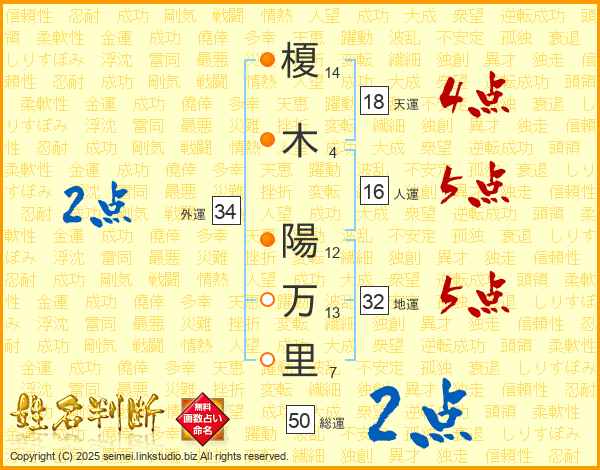 榎(14画)木(4画) 陽(12画)万(13画)里(7画)