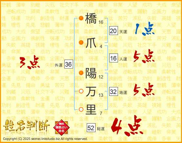 橋(16画)爪(4画) 陽(12画)万(13画)里(7画)
