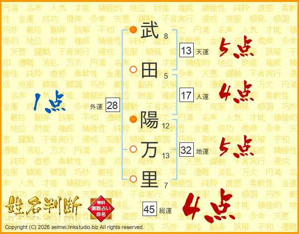 武(8画)田(5画) 陽(12画)万(13画)里(7画)