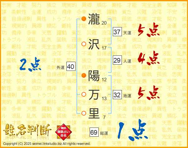 瀧沢陽万里さんの天運は37画の5点!