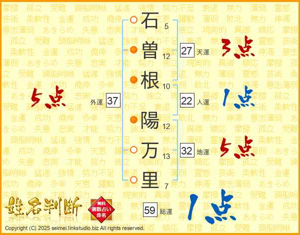 石(5画)曽(12画)根(10画) 陽(12画)万(13画)里(7画)