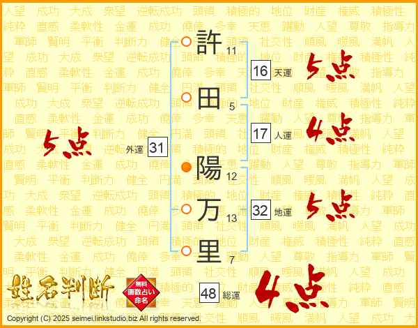 許(11画)田(5画) 陽(12画)万(13画)里(7画)
