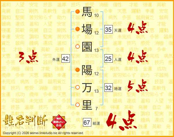 馬(10画)場(12画)園(13画) 陽(12画)万(13画)里(7画)