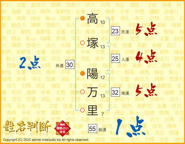 高(10画)塚(13画) 陽(12画)万(13画)里(7画)