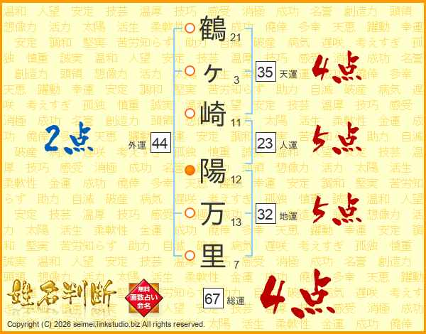 鶴ヶ崎陽万里さんの総運は67画の4点!