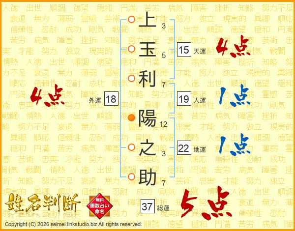 上(3画)玉(5画)利(7画) 陽(12画)之(3画)助(7画)