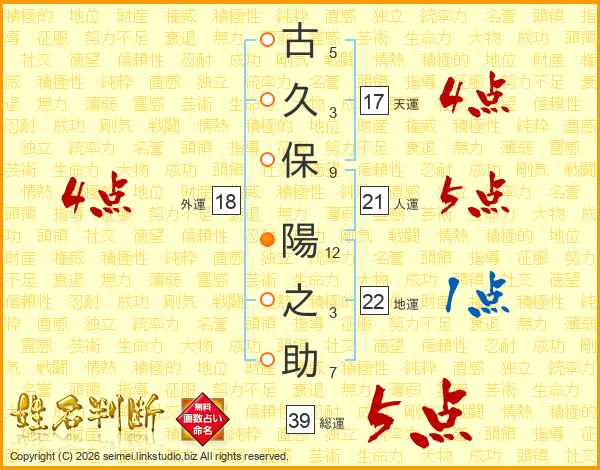 古久保陽之助さんの総運は39画の5点!