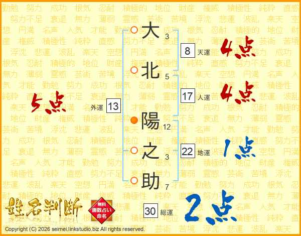 大(3画)北(5画) 陽(12画)之(3画)助(7画)