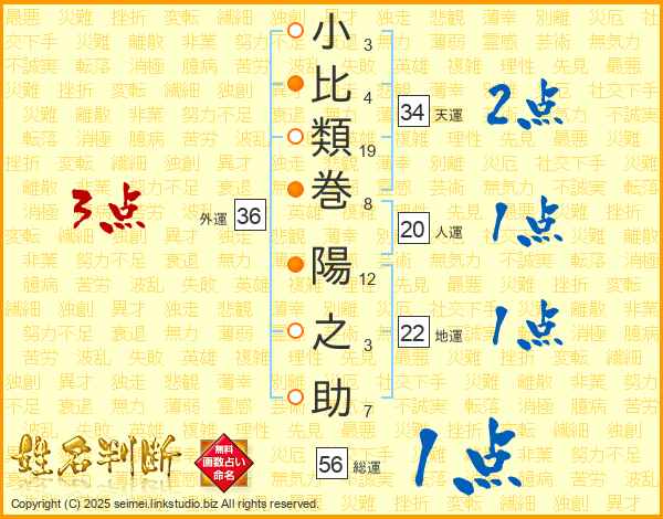 小(3画)比(4画)類(19画)巻(8画) 陽(12画)之(3画)助(7画)