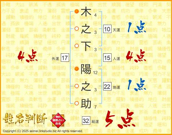 木(4画)之(3画)下(3画) 陽(12画)之(3画)助(7画)