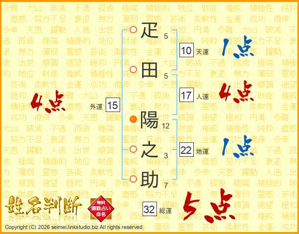 生活面を象徴する運勢です。外部から受ける影響力を表し、結婚運、家庭運や職場、環境への順応性を表します。総運から人運を引いた画数。姓や名が1文字の場合を除く。