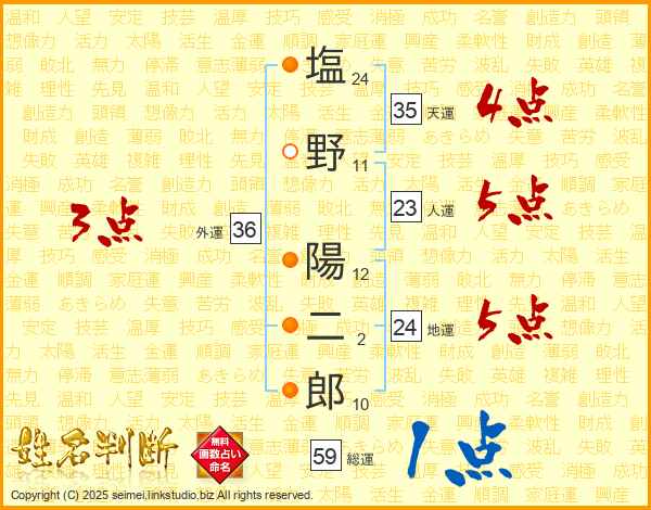 塩(24画)野(11画) 陽(12画)二(2画)郎(10画)