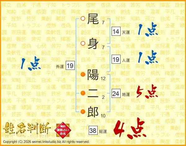 尾(7画)身(7画) 陽(12画)二(2画)郎(10画)