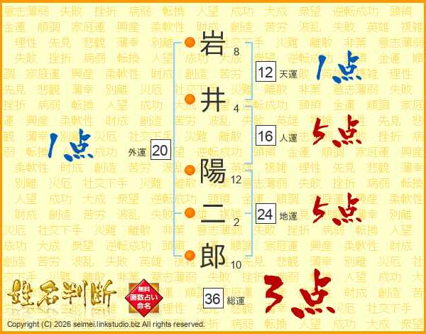岩(8画)井(4画) 陽(12画)二(2画)郎(10画)