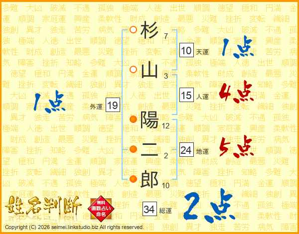 杉(7画)山(3画) 陽(12画)二(2画)郎(10画)