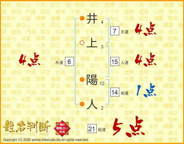 生活面を象徴する運勢です。外部から受ける影響力を表し、結婚運、家庭運や職場、環境への順応性を表します。総運から人運を引いた画数。姓や名が1文字の場合を除く。