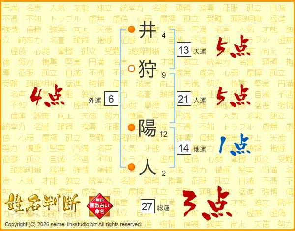 井(4画)狩(9画) 陽(12画)人(2画)