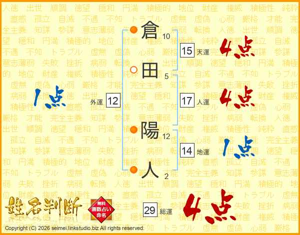 生活面を象徴する運勢です。外部から受ける影響力を表し、結婚運、家庭運や職場、環境への順応性を表します。総運から人運を引いた画数。姓や名が1文字の場合を除く。