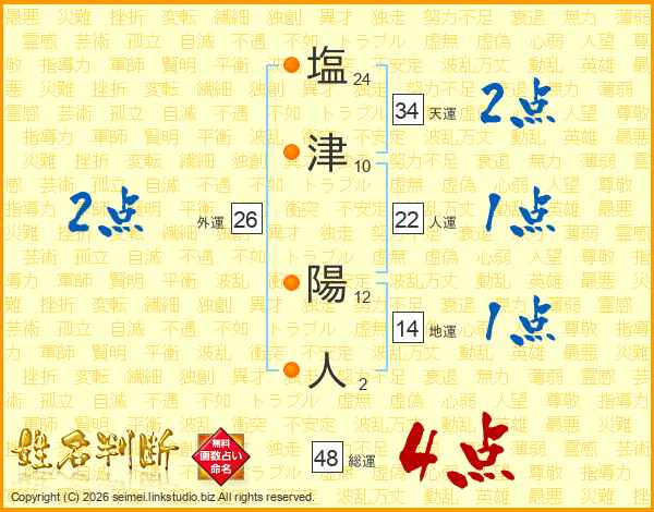 塩(24画)津(10画) 陽(12画)人(2画)