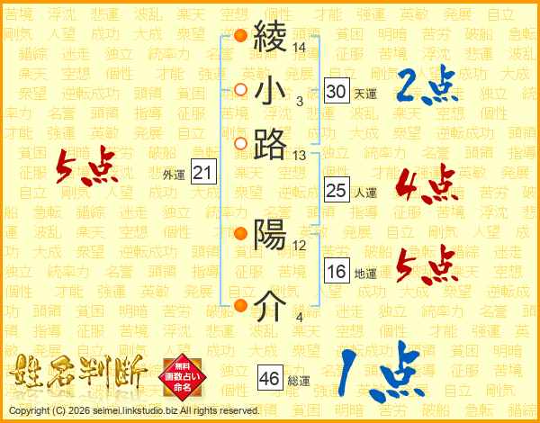 綾(14画)小(3画)路(13画) 陽(12画)介(4画)