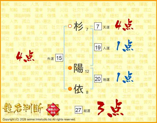 杉(7画) 陽(12画)依(8画)