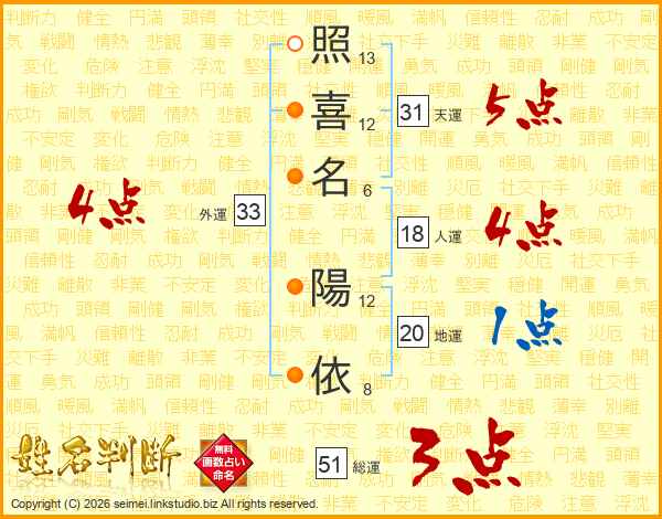 照(13画)喜(12画)名(6画) 陽(12画)依(8画)