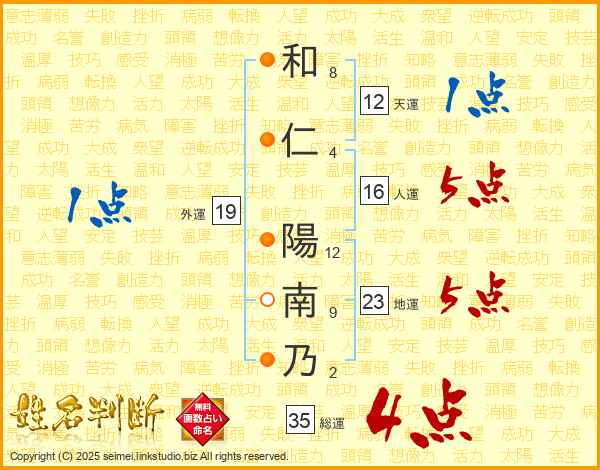 和(8画)仁(4画) 陽(12画)南(9画)乃(2画)