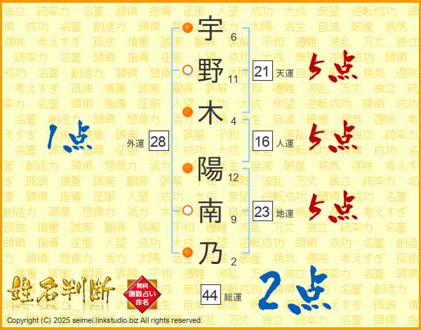 宇(6画)野(11画)木(4画) 陽(12画)南(9画)乃(2画)