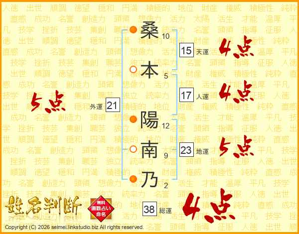 桑(10画)本(5画) 陽(12画)南(9画)乃(2画)