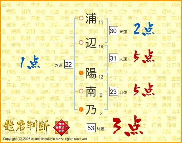 浦(11画)辺(19画) 陽(12画)南(9画)乃(2画)