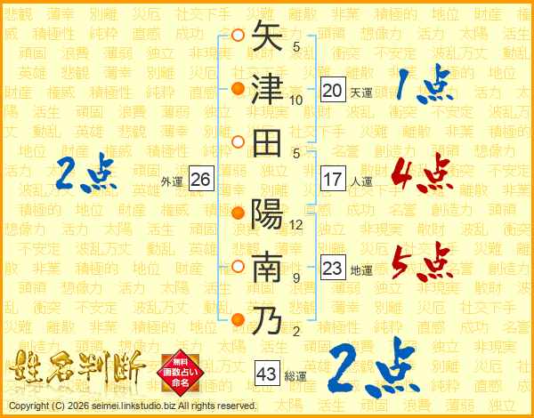 矢(5画)津(10画)田(5画) 陽(12画)南(9画)乃(2画)