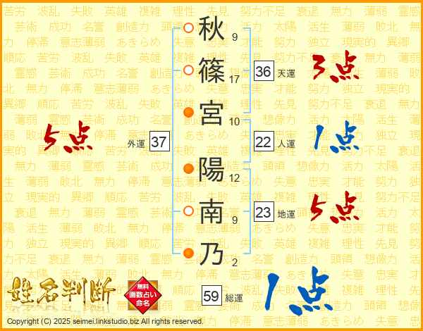 秋(9画)篠(17画)宮(10画) 陽(12画)南(9画)乃(2画)