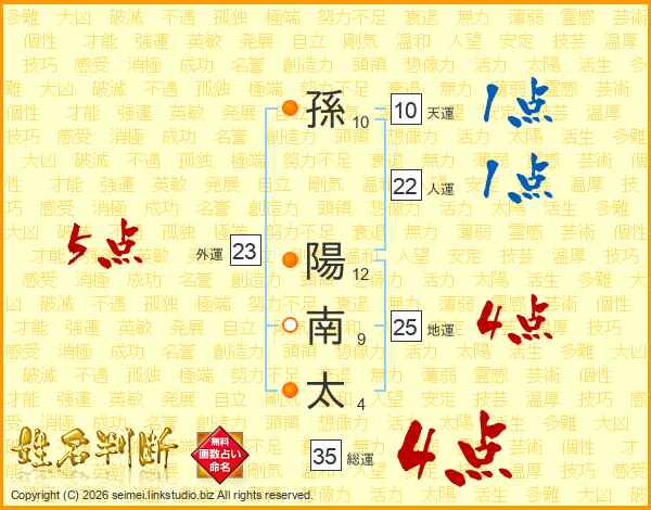 生活面を象徴する運勢です。外部から受ける影響力を表し、結婚運、家庭運や職場、環境への順応性を表します。総運から人運を引いた画数。姓や名が1文字の場合を除く。