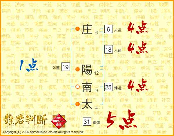 生活面を象徴する運勢です。外部から受ける影響力を表し、結婚運、家庭運や職場、環境への順応性を表します。総運から人運を引いた画数。姓や名が1文字の場合を除く。