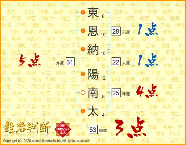 東(8画)恩(10画)納(10画) 陽(12画)南(9画)太(4画)