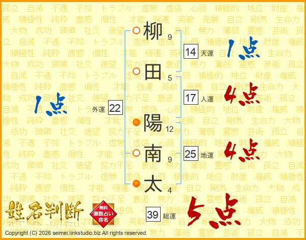 柳田陽南太さんの総運は39画の5点!