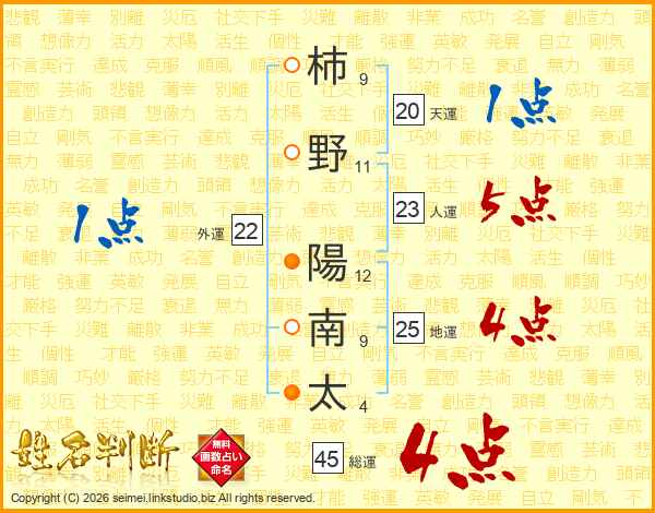 柿(9画)野(11画) 陽(12画)南(9画)太(4画)