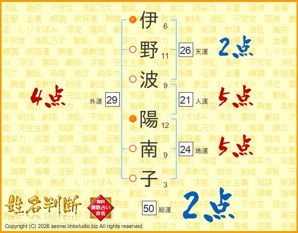 伊(6画)野(11画)波(9画) 陽(12画)南(9画)子(3画)