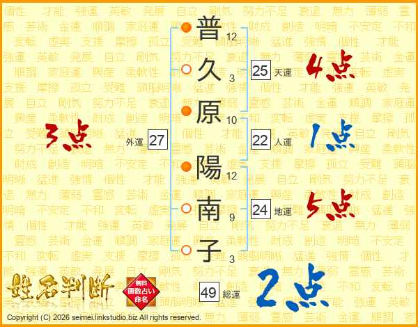 普(12画)久(3画)原(10画) 陽(12画)南(9画)子(3画)