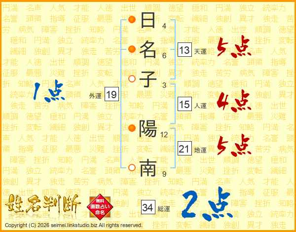 日(4画)名(6画)子(3画) 陽(12画)南(9画)