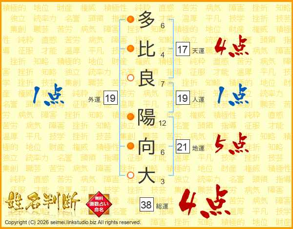 多比良陽向大さんの総運は38画の4点!
