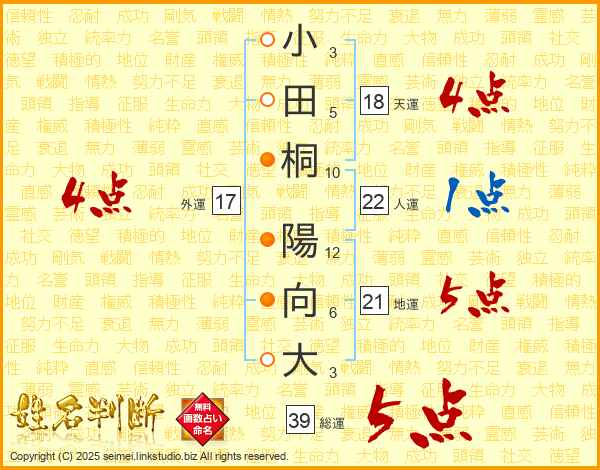 小(3画)田(5画)桐(10画) 陽(12画)向(6画)大(3画)