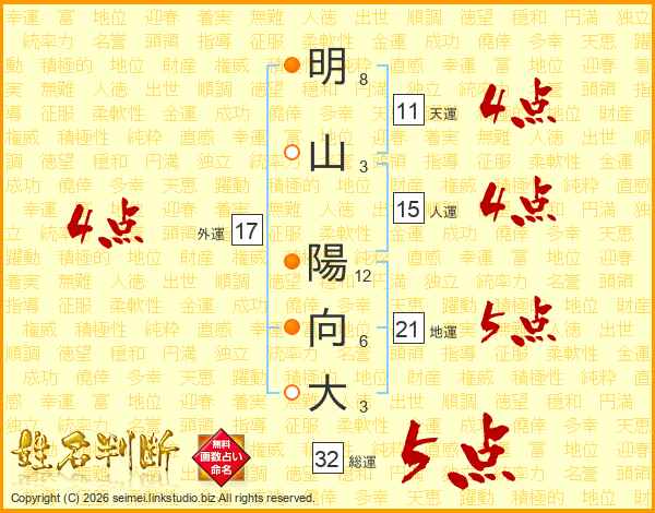明(8画)山(3画) 陽(12画)向(6画)大(3画)